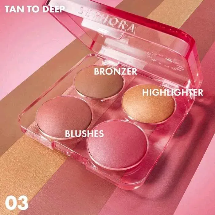 Qué es: Una paleta facial todo en uno que ofrece cuatro tonos esenciales: dos rubores, un bronceador y un iluminador, para dar calidez, color e iluminación al rostro.