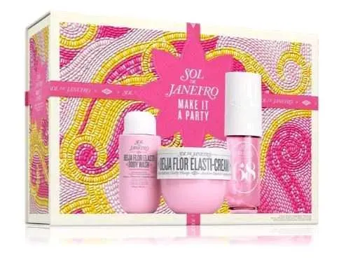 Sol de Janeiro Make It a Party Set es un kit corporal edición limitada con aroma Cheirosa 68, ideal para regalar o para quienes aman rutinas súper sensoriales y florales-frutales. Reúne tres best sellers para limpiar, hidratar y perfumar la piel de pies a cabeza con notas de jazmín brasileño y pitah...